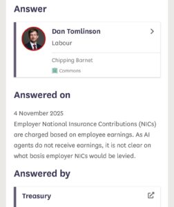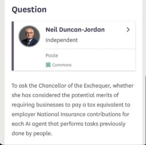 Last week, Neil Duncan-Jordan, independent MP for Poole, asked whether businesses that replace human workers with AI agents should pay a levy equivalent to the rate of employer’s NIC.